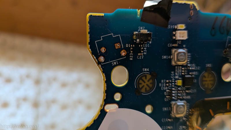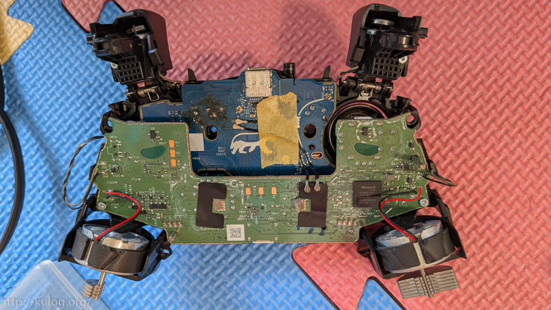 最初のフレームの外し方は前回の記事を参照していただきまして、ここまでバラしました。写真では分かりにくいですが、マスキングテープの右側にある半田を外すことで、LBボタンのタクトスイッチを交換できます。LBボタン側には近くにケーブルもあるので、作業しやすいように緑の基盤も外して青い基盤だけにします。トルクスドライバー T6が必要です。