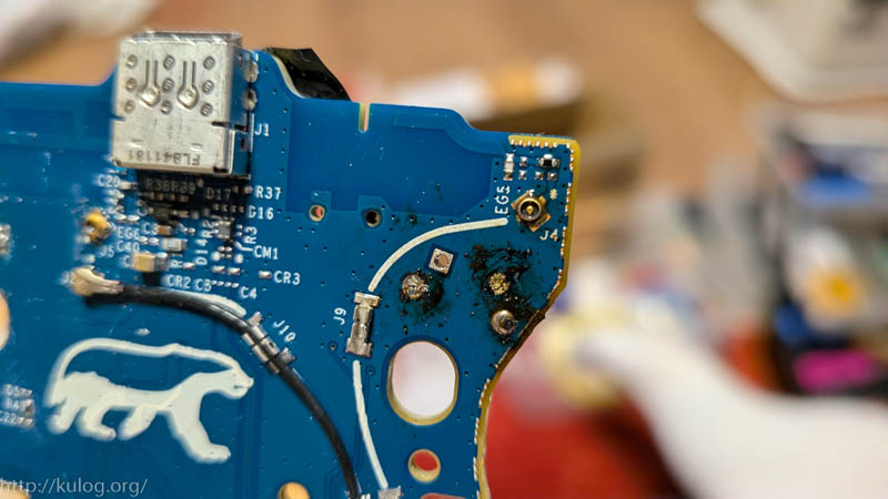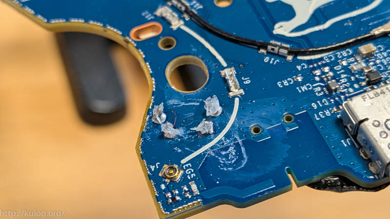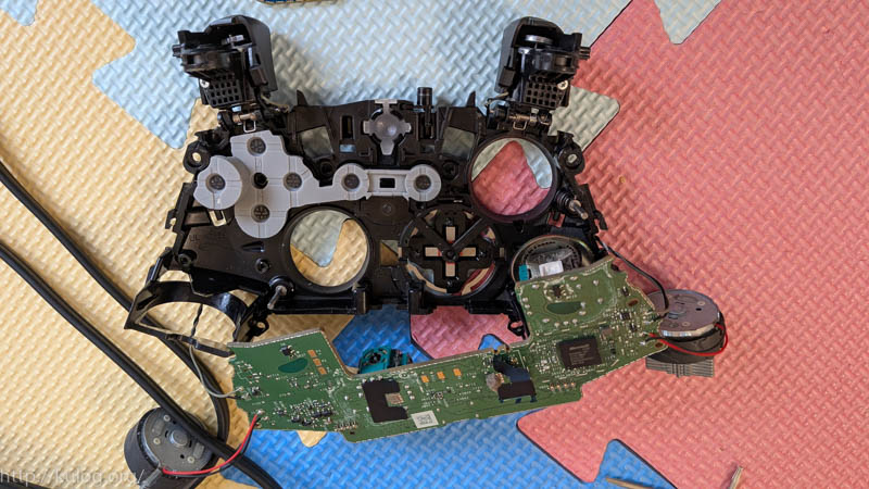 ここまで外すには、緑の基盤から裏側に伸びている配線を爪から外しておくとやりやすいです。これを外しているところの写真は撮り忘れちゃいました。