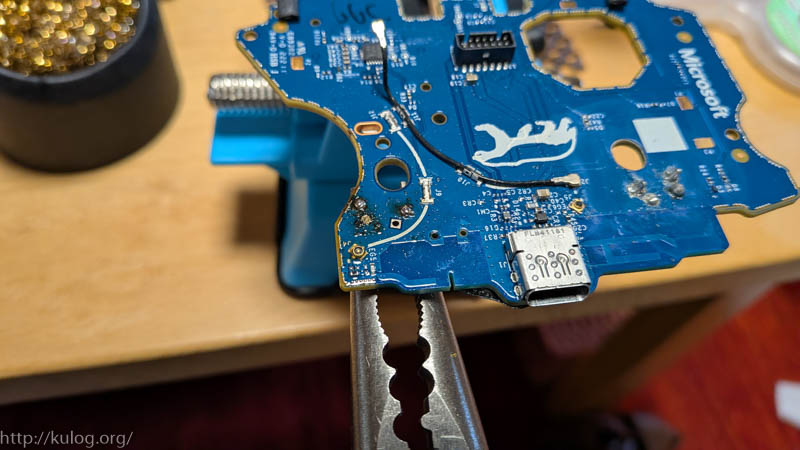RBボタンの時と比べて比較的簡単にはんだが吸い取れました。完全には吸い取れないので、ラジオペンチでタクトスイッチをつかみ、はんだごてを当てて、はんだが溶けるのを見計らってタクトスイッチを引き抜きます。