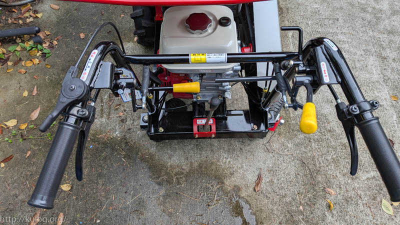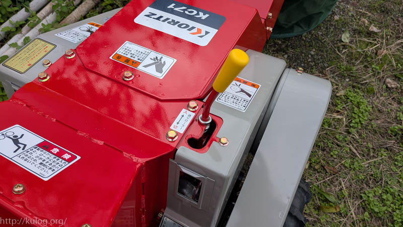 右の黄色のレバーは「走行クラッチレバー」です。上に持ち上げれば走り始めます。