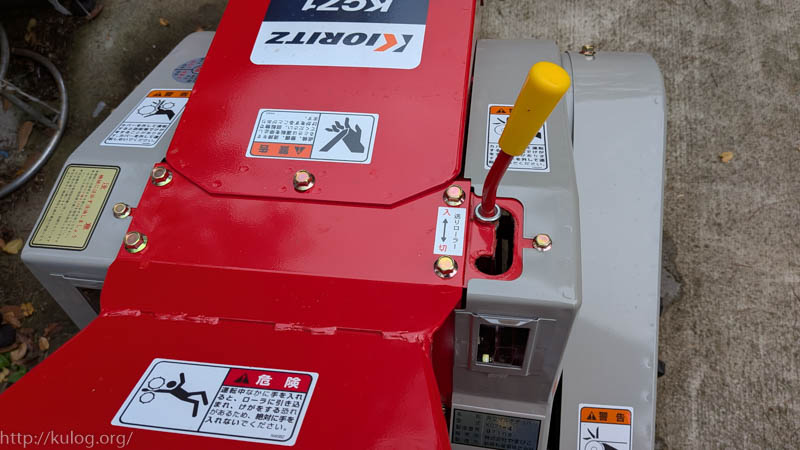 左のレバーは作業クラッチレバーです。これも上に持ち上げると粉砕作業ができるようになります。