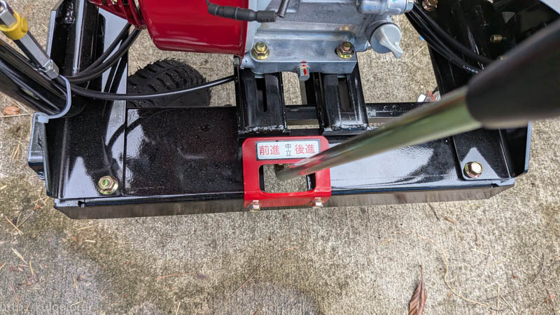 「作業クラッチレバー」を引き上げ終わったら「スロットルレバー」をマックスにします。エンジンマックスだとすごい音かなと覚悟していましたが予想より静かな音でした。