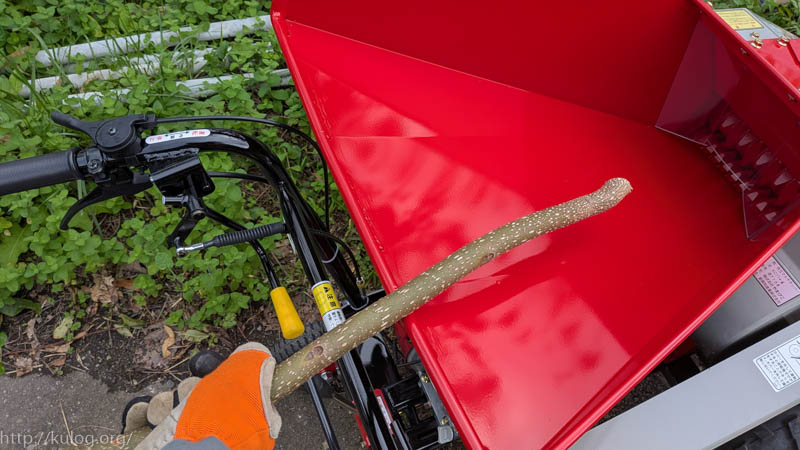 軽トラに積み込むときが恐ろしいです。うっかりするとチッパーの下敷きになってしまいます。乗せるときは前進で、下ろすときは後退します。KC71/4の後輪はくるくる回るので、降りるときが注意が必要です。