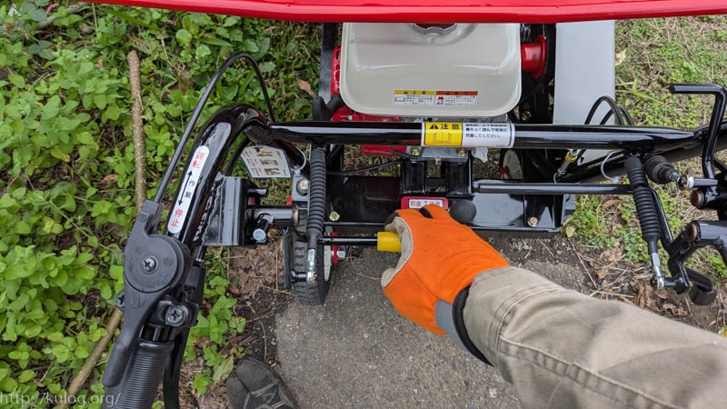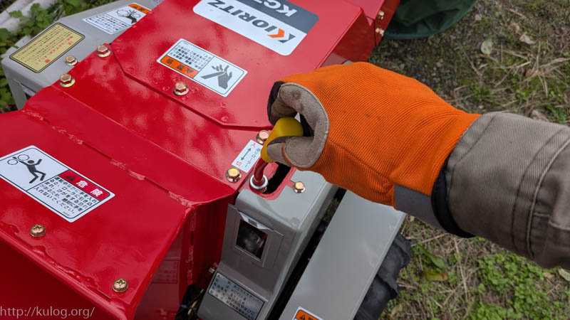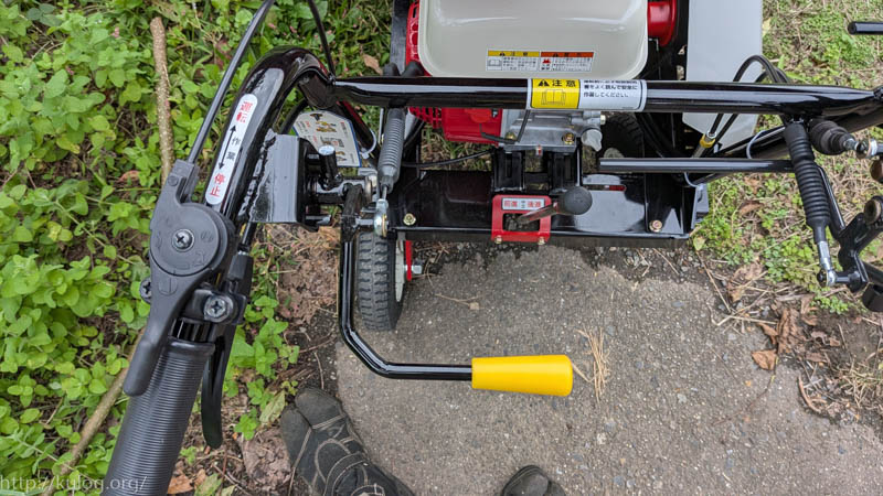 粉砕作業をする場合は、左の「作業クラッチレバー」をゆっくり引きます。急いで引くとエンジンが切れてしまうので注意。ゆっくりやるのがコツでした。