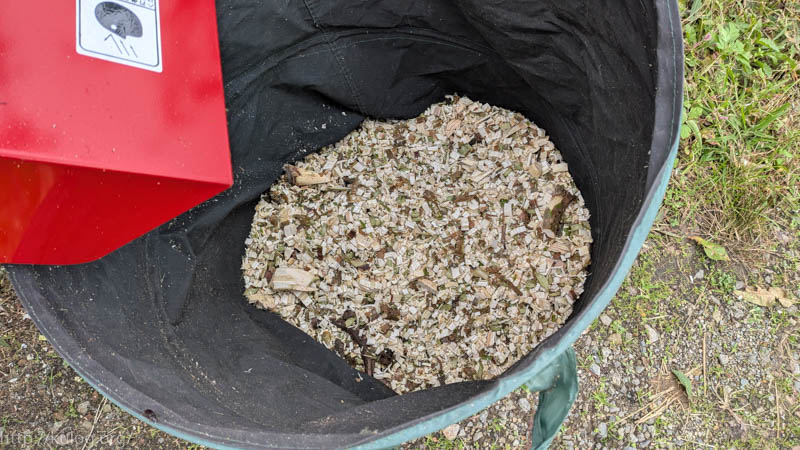 想像通りに粉砕してくれています。一部、大きいものもありますが許容範囲内です。このチップは草が生えて欲しくないところにまいておくと生えてこなくなるそうです。いやあ、ほんといい物を買って大満足です。